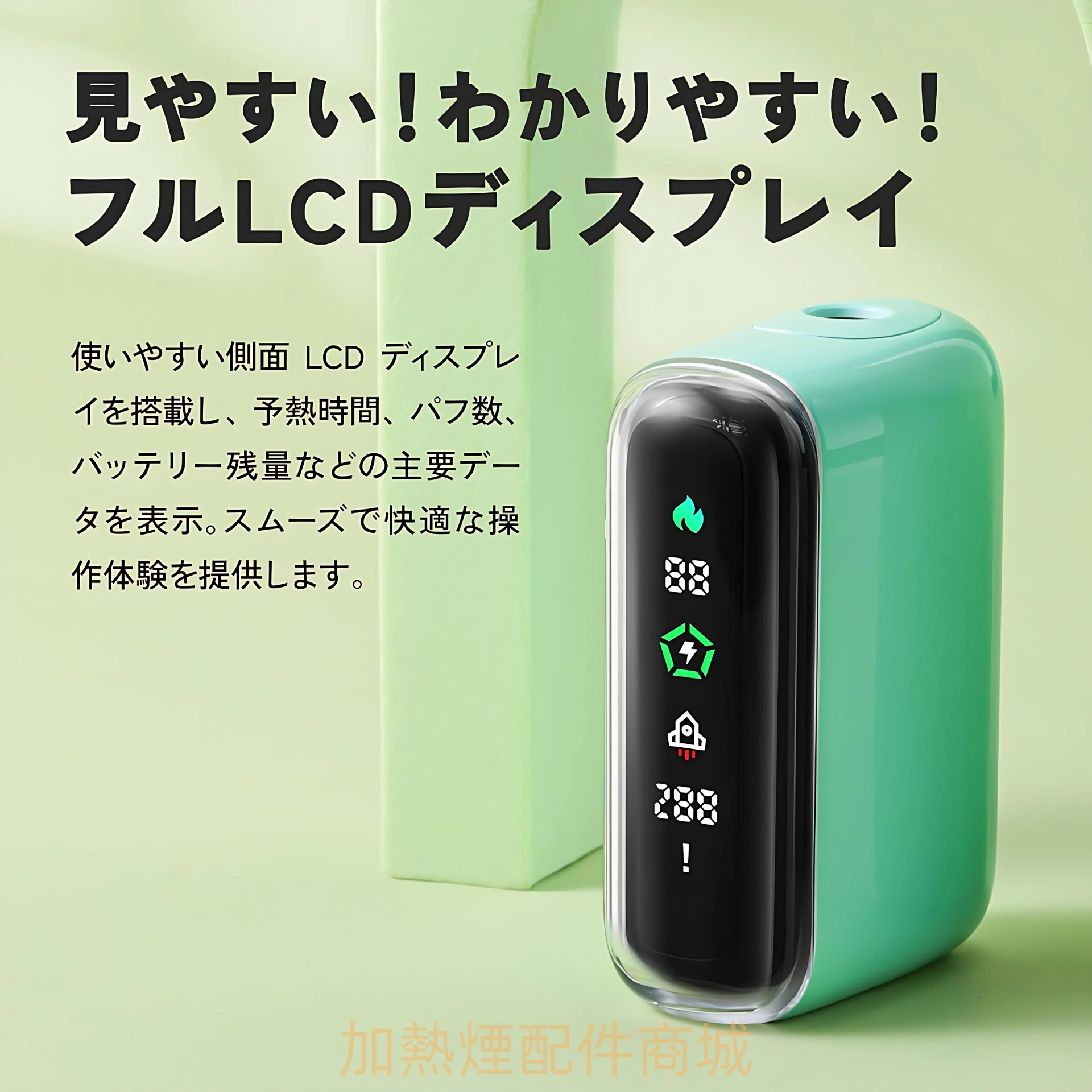 側邊搭載 全螢幕 LCD 顯示屏,可顯示電量、吸入次數與預熱狀態等資訊,一目了然提升操作便利性。